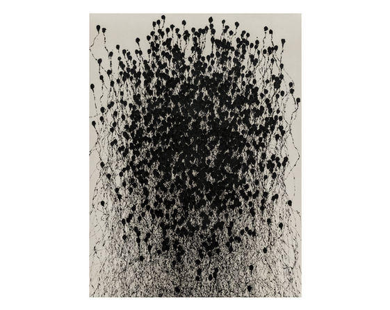 잊지 않아야 할 또 한 가지는 이 작업이 시작되는 첫 순간부터 작가의 의지가 배제된다는 점이다. 출발점은 작가가 공중에 던진 안료가 묻은 작고 동그란 고무패킹이 중력에 의해 자유낙하한 지점이다. 첫 번째 구르기의 시점이 이렇게 설정된다. 돌은 안료를 머금은 채 기울어진 캔버스의 아래쪽으로, 구불구불한 궤적을 남기며 천천히 굴러간다. 돌이 캔버스의 각 변의 끝에 다다를 즈음, 작가는 캔버스의 기울기를 달리해 다른 쪽으로 구르도록 만든다. 돌에 묻은 안료가 소진되어 구르는 돌의 궤적이 희미해기 시작하면, 다시 돌을 안료 통에 넣었다 빼서 이제까지의 과정을 되풀이한다.