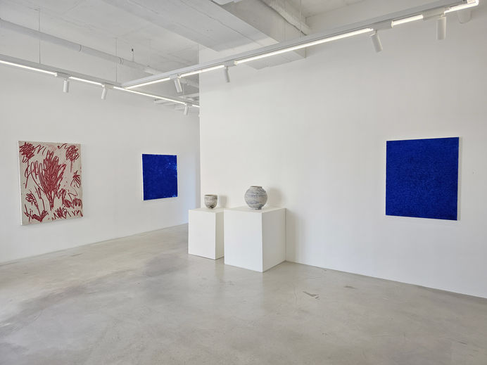 김춘수는 30여 년간 울트라마린이라는 단일 색상과의 대화를 지속해왔다. 1990년대 초반 ‘수상한 혀’ 시리즈에서 시작된 그의 작업은 언어로 표현할 수 없는 것을 손의 움직임으로 번역하는 시도였다. 붓 대신 손으로 직접 물감을 문지르는 행위는 단순한 기법적 실험을 넘어서는 의미로, 회화 도구와 신체 사이의 경계를 허물고 작가의 의식과 무의식이 직접적으로 전이되는 과정이다. 수백, 수천 번의 반복된 손동작은 마치 묵묵히 기도를 올리는 듯한 명상적 행위가 되며, 이는 화면에 축적되어 깊이 있는 색면으로 구현된다. 특히 그의 최근 작업들은 더욱 강렬한 물질성과 촉각성을 보여주는데, 이는 회화의 평면성을 뛰어넘은 공간적 깊이감을 담아내고 있다.